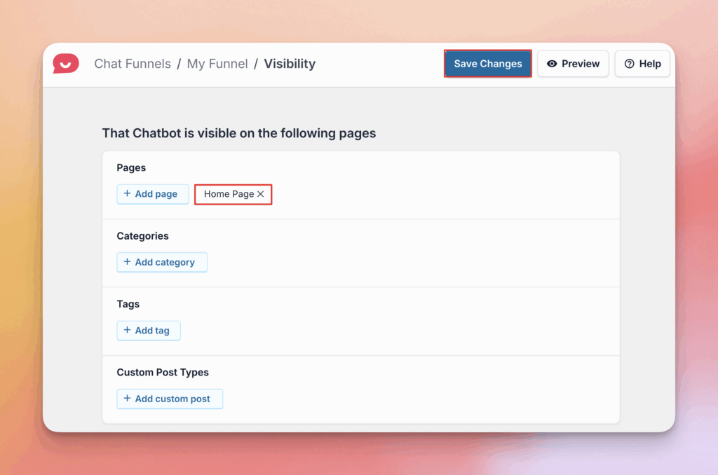WPChat lets you set visibility rules by specific pages, categories, tags, or custom post types. Use this to focus your chat coverage where it matters most.