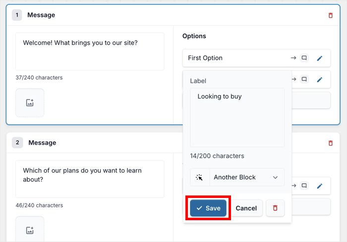 - To Another Block: Visitors will be sent to another message on this chat funnel if they click