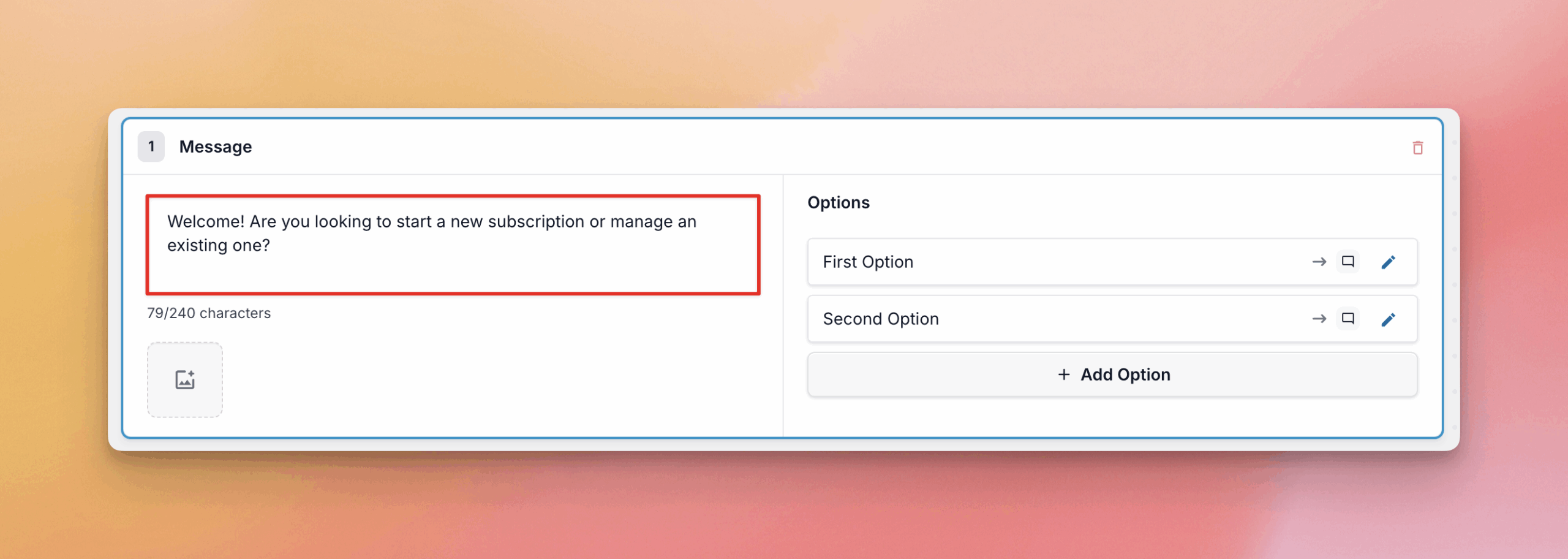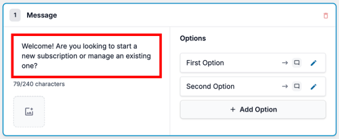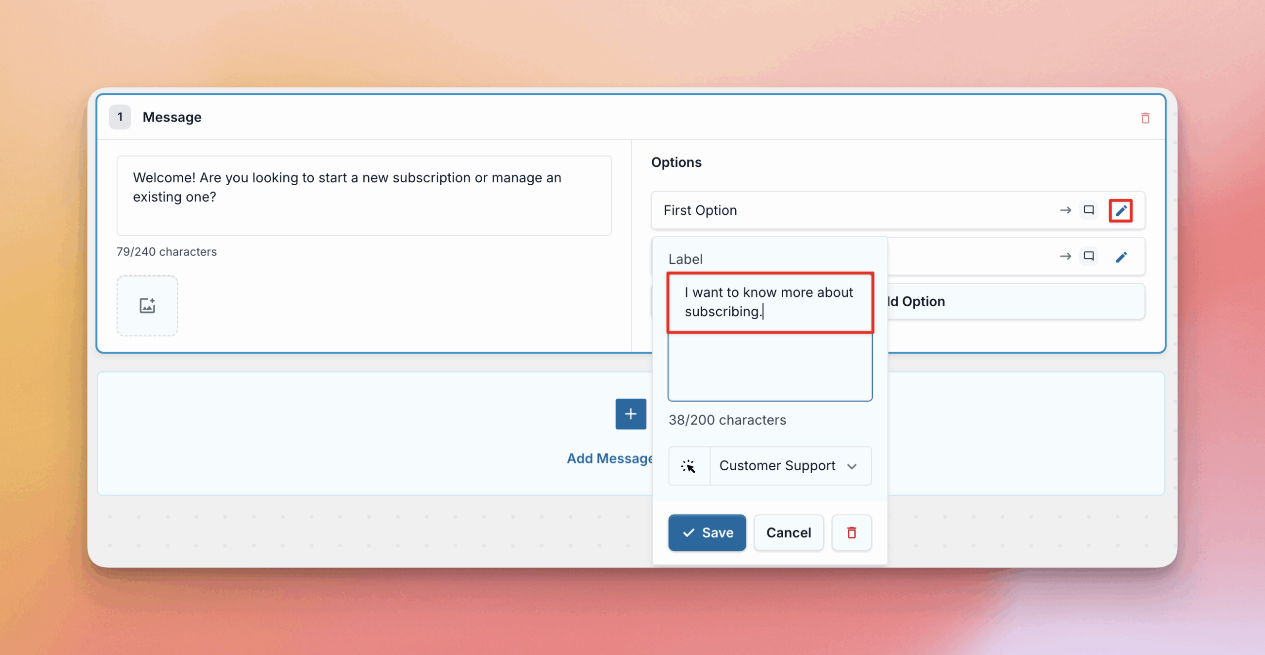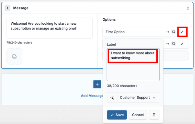 4. For each Option, you can click the edit (pencil) icon to change what happens when a visitor select this option. It can either direct them to Customer Support or to another message within the funnel. This is how you can control the flow of the funnel.