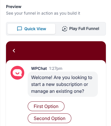Watch the live preview on the right to see how the changes you make to Messages and Options update your funnel. You can also click the options to test the funnel flow.