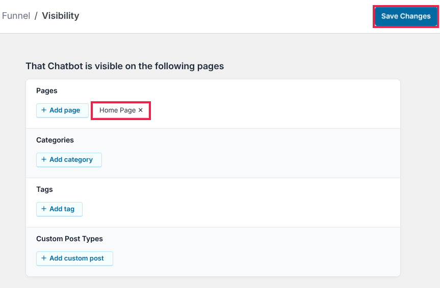6. Once you set up the funnel, click Save Changes and you’ll be taken to the funnel’s visibility settings. Select the Pages, Categories, Tags, or Custom Post Types where this funnel should appear. Click Save Changes again once you’ve set the visibility to your preference.