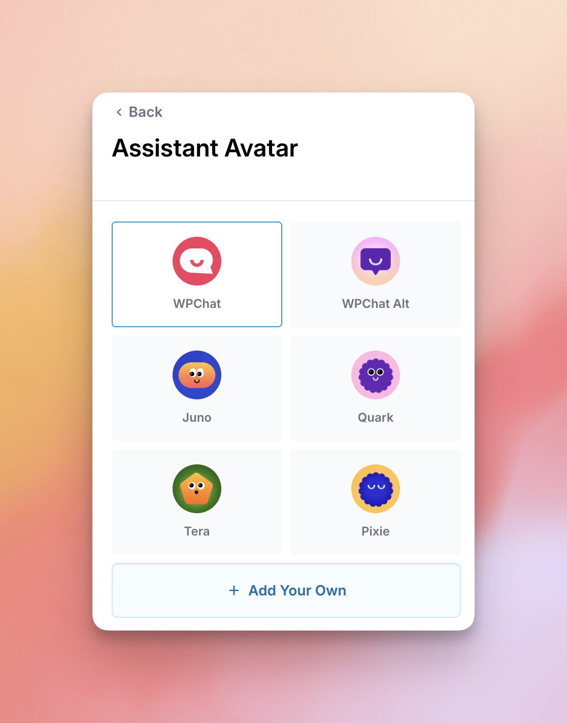 Here you can set the avatar image for the chat assistant. You can choose from one of the preset avatars or create your own.