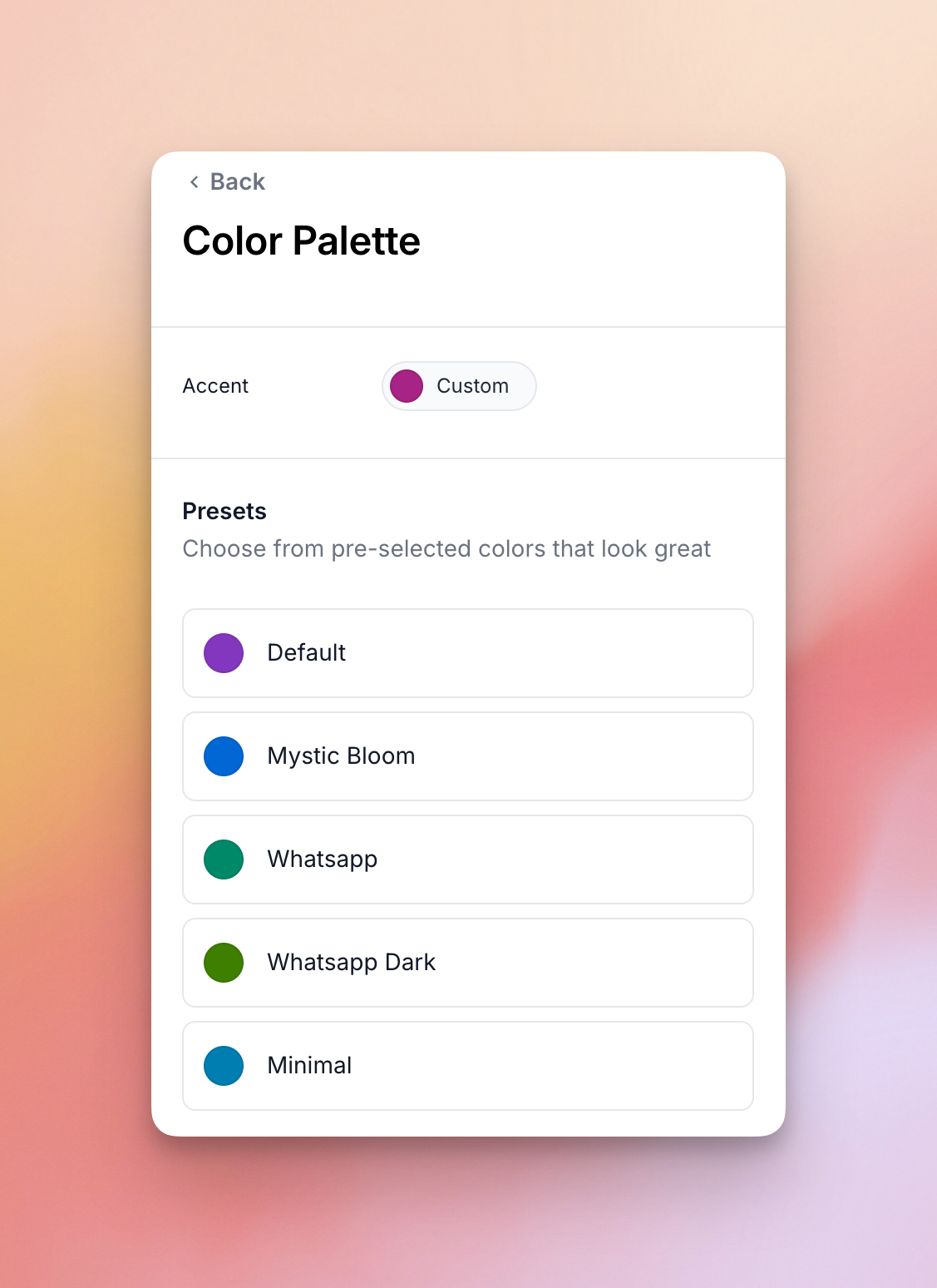If you’d like to change the color of you chat widget, select one of the Preset color palettes, or create your own by setting the Accent Hue/Color to base your color palette on.