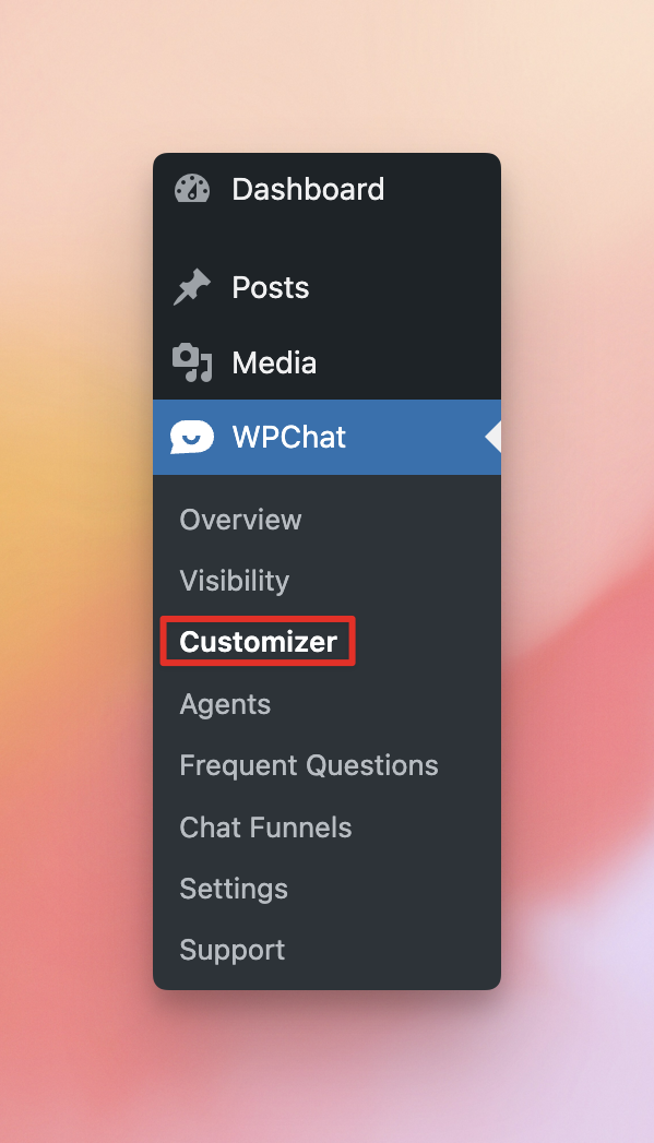To customize the appearance and behavior of your chat widget, first go to WordPress Dashboard > WP Chat > Customizer