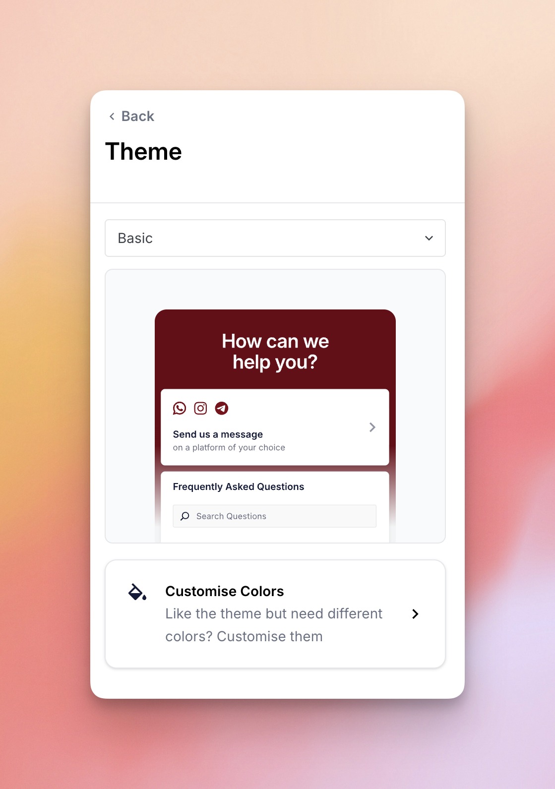With the Customizer, you can adjust the Theme, Color Palette, Header, Icon, Assistant Avatar, and Sections of your chat widget. As you adjust the customization options, the live preview of your chat widget will update instantly so you can see how your widget will appear on the page.