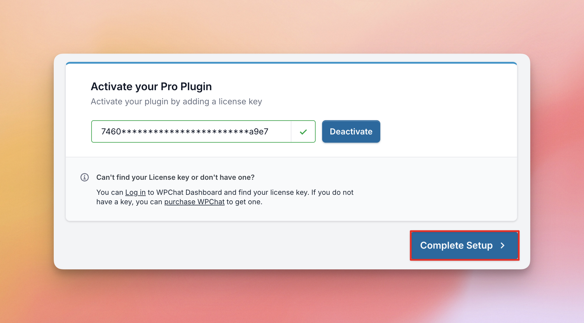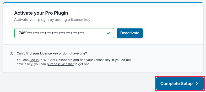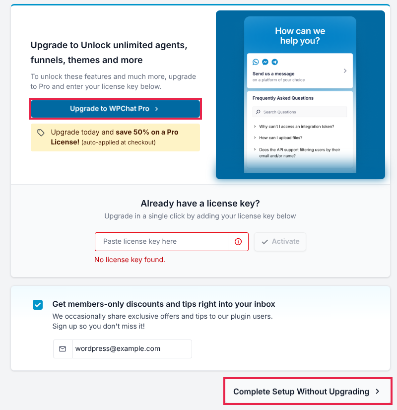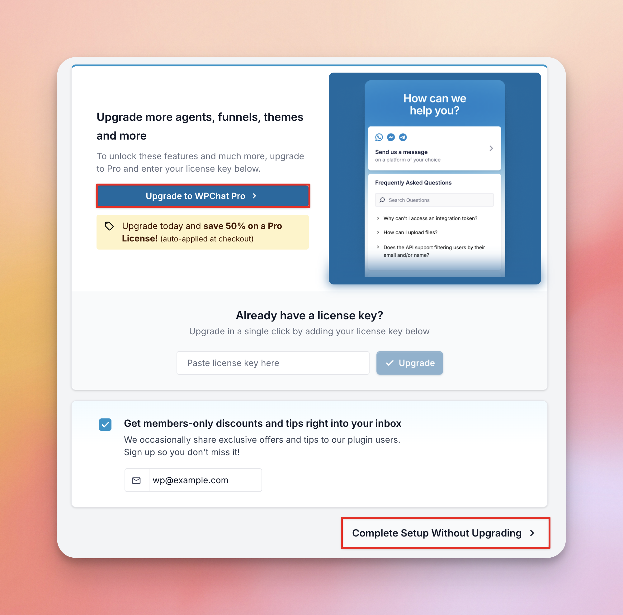 Then you can either Upgrade to WPChat Pro and enter your license key, or Complete Setup Without Upgrading