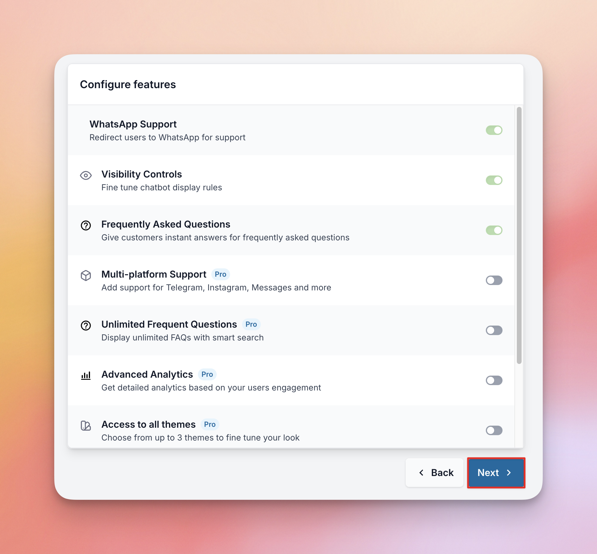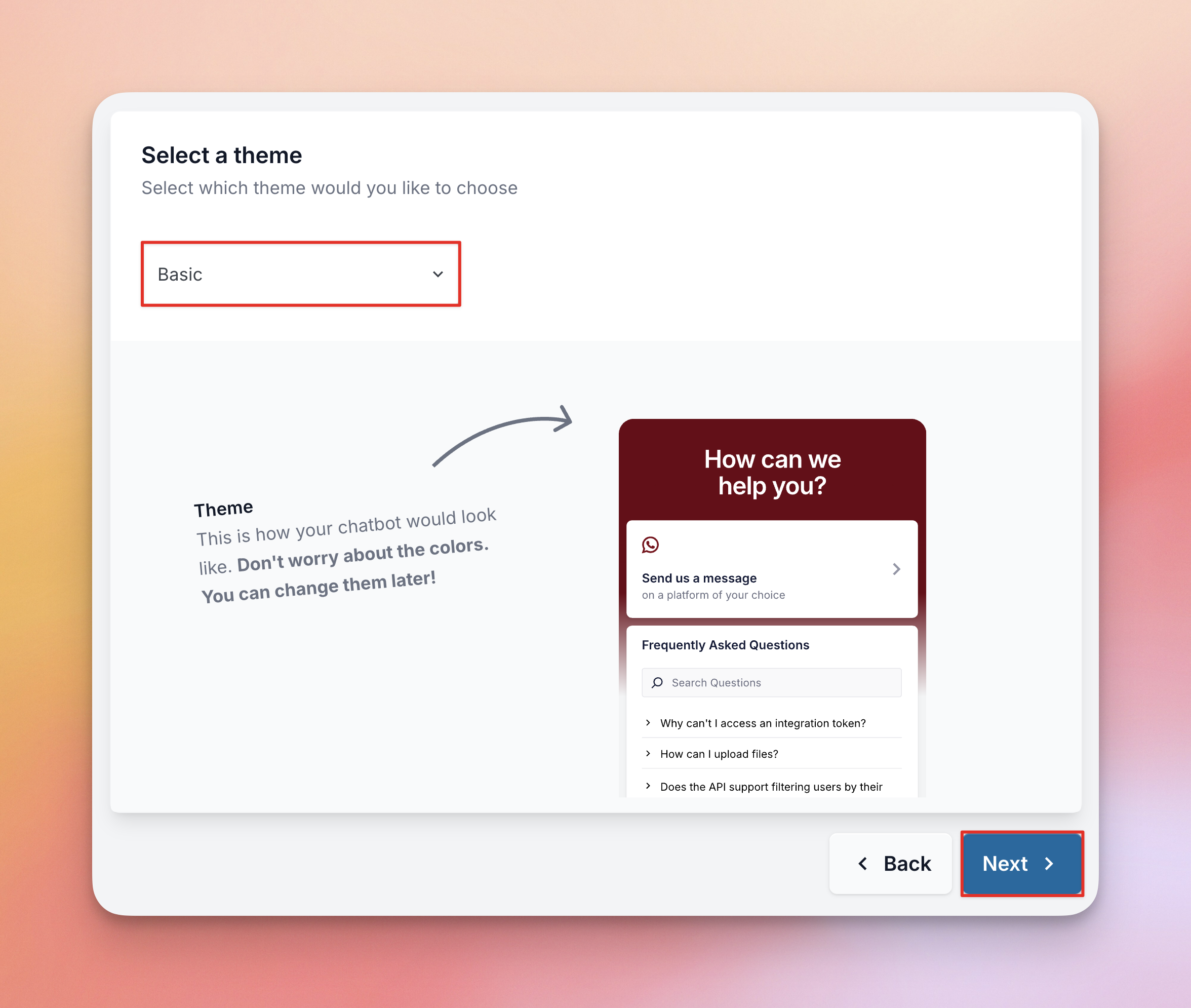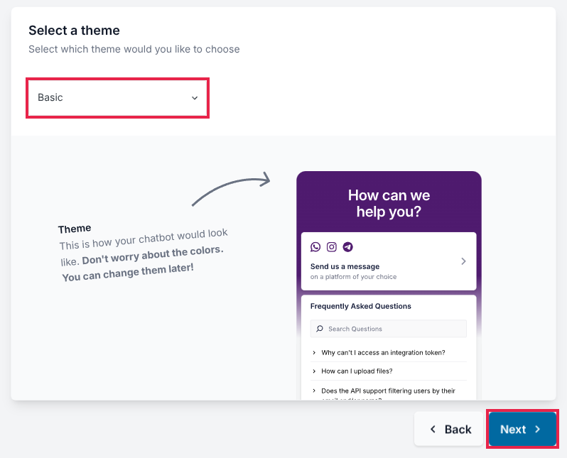 3. Select a theme (Basic, Night, or Pastel). When you select a theme, you’ll see a live preview of how your chat widget will look. Don’t worry, you can always change themes or customize your theme later! Click Next once you’ve selected a theme.