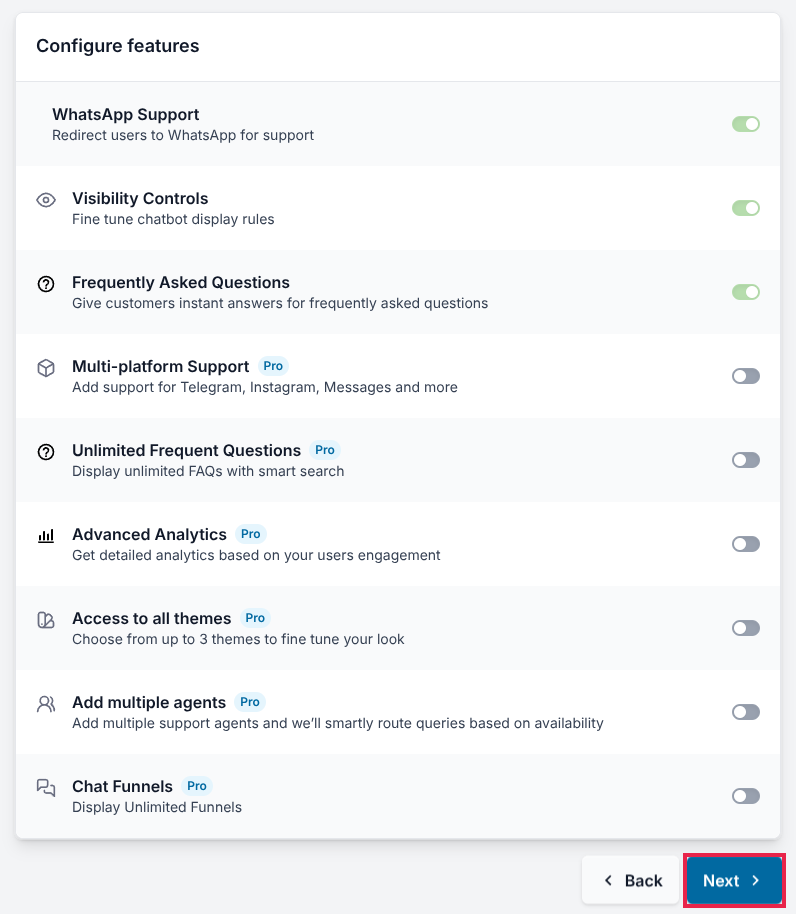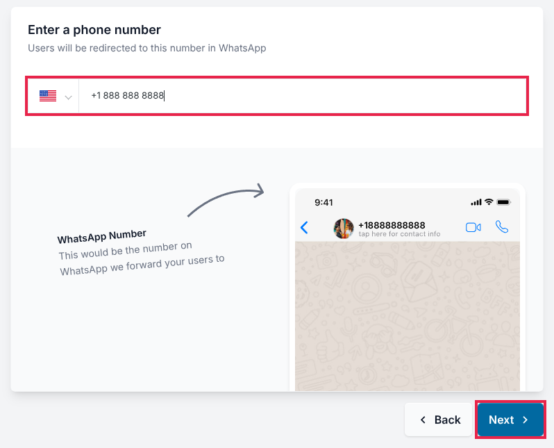 2. Enter your phone number and click Next. This will be the phone number that WhatsApp messages will be sent to for you first WPChat Agent.