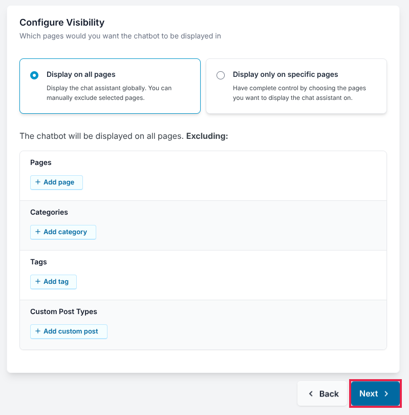 4. Choose the visibility of the chatbot. You can either display on all pages, with the option to exclude specific pages, tags, categories, or post types, or you can only add it only to specific pages, categories, or post types you select.