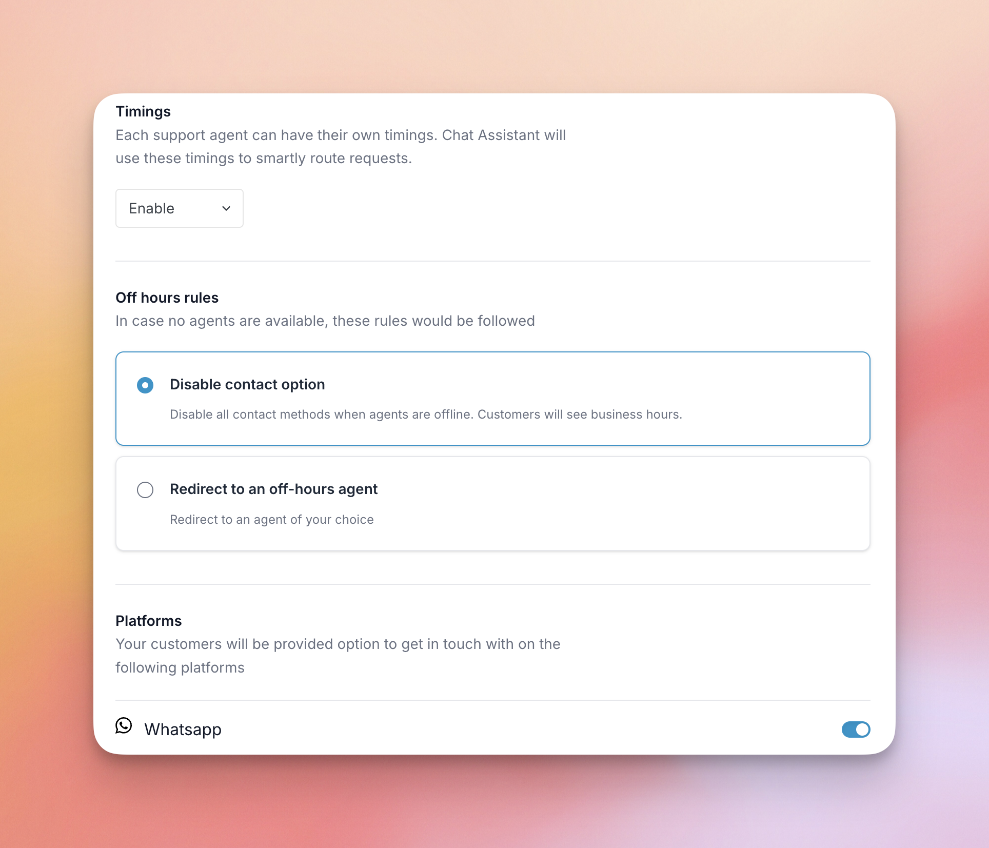From here you can adjust the Timings of when specific agents will handle requests and Off-Hours Rules.