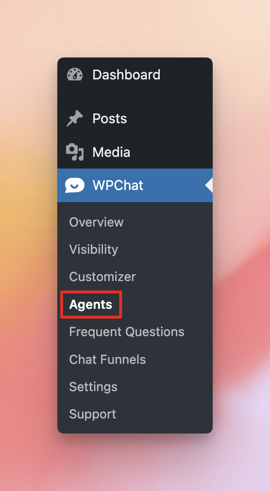 To access the agents, go to WordPress Dashboard > WPChat > Agents