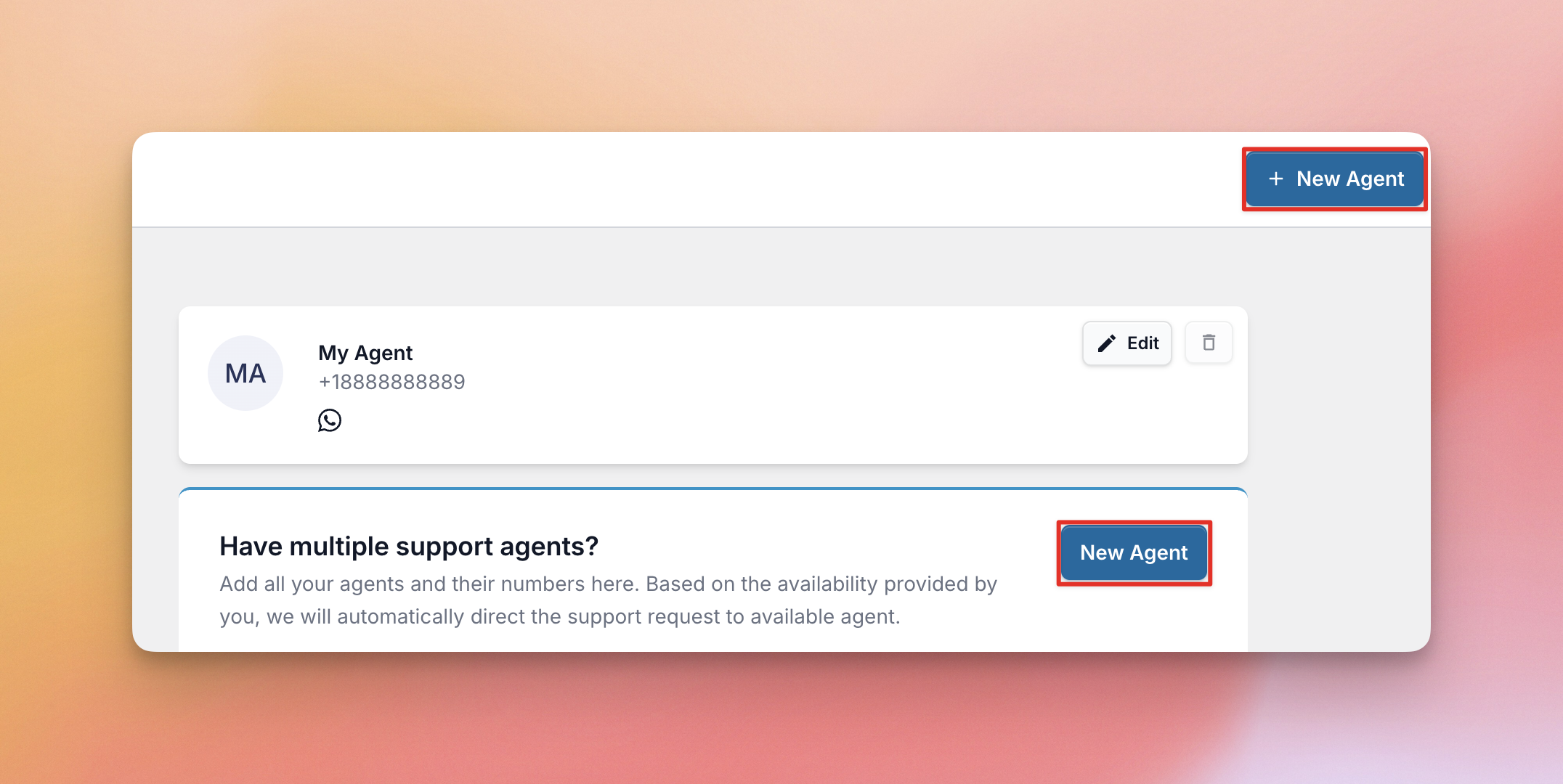 After you complete the initial setup of WPChat, your first support agent has already been created automatically. In the Agents area, you can customize your agent, create new ones, or perform other agent management tasks.